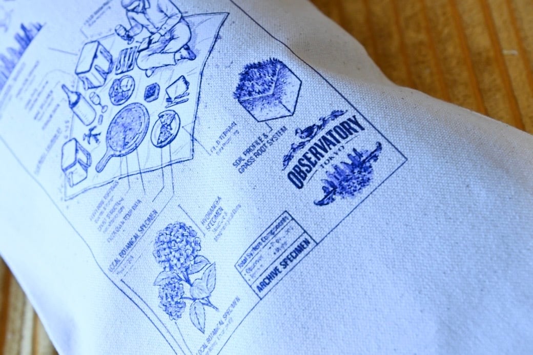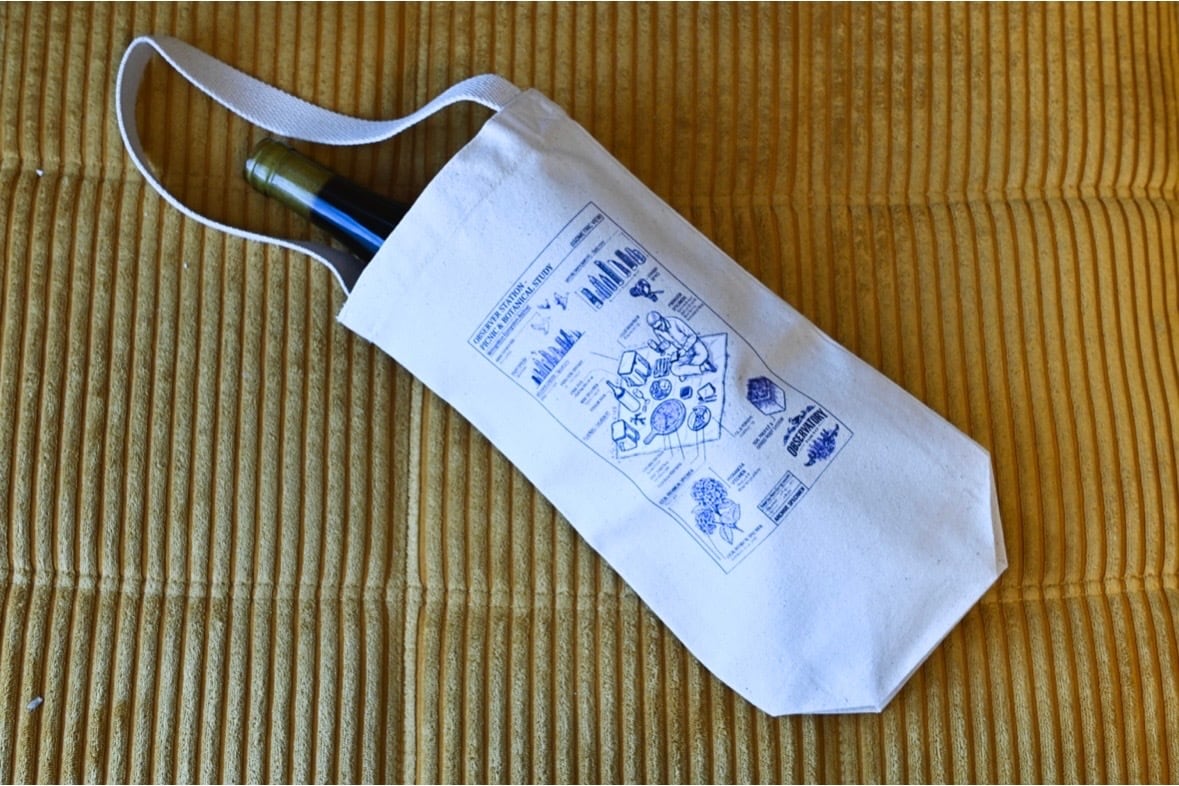 芝生にピクニックシートを広げ、メモ用紙を片手にワインとピザを楽しむ様子を、アイソメトリック(等角投影図)で詳細にデザインしたワインボトルトート。